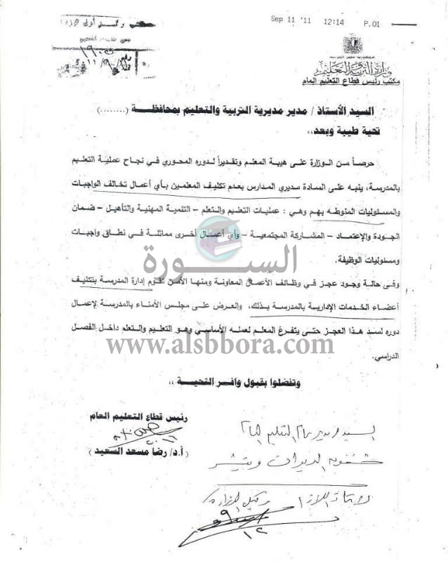 ارسلت وزارة التربية والتعليم فاكسا الى المديريات والادارات التعليمية تنبه على مديرى المدارس بعدم تكليف المعلمين بأى أعمال تخالف الواجبات والمسئوليات المنوطة بهم وهى: عمليات التعليم والتعلم، التنمية المهنية والتأهيل، ضمان الجودة والاعتماد، المشاركة المجتمعية، وأى أعمال أخرى مماثلة فى نطاق واجبات ومسئوليات الوظيفة.