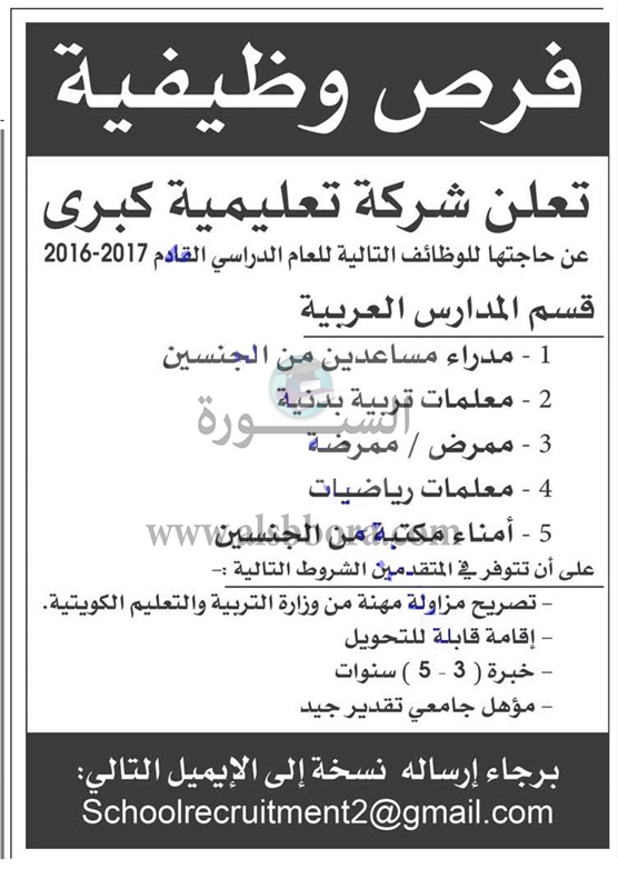 تعلن مؤسسة تعليمية في دولة الكويت عن وظائف جديدة للمعلمين وذلك وفقا لنص الإعلان التالي: