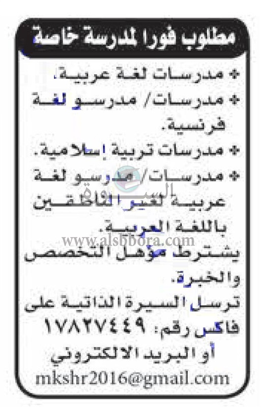 يعلن مركز تعليمي في مملكة البحرين عن وظائف شاغرة للمعلمين وذلك في المواد الواردة في نص الاعلان التالي: