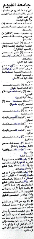 تعلن جامعة الفيوم عن وظائف شاغرة لأعضاء هيئة التدريس من معيد الي أستاذ وذلك وفقا لنص الإعلان التالي: