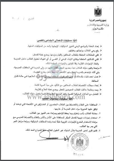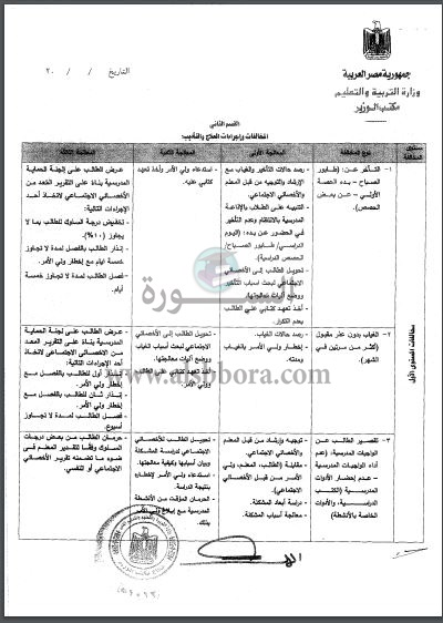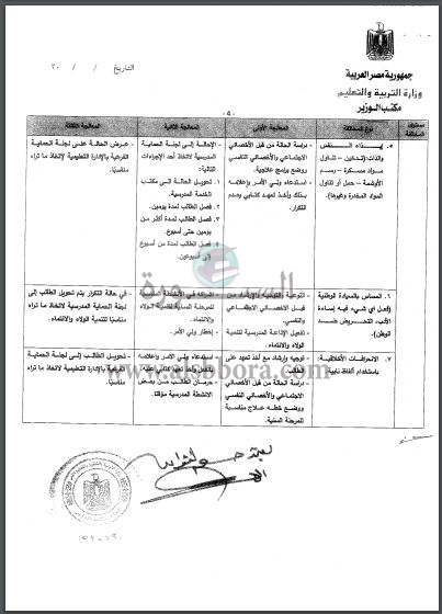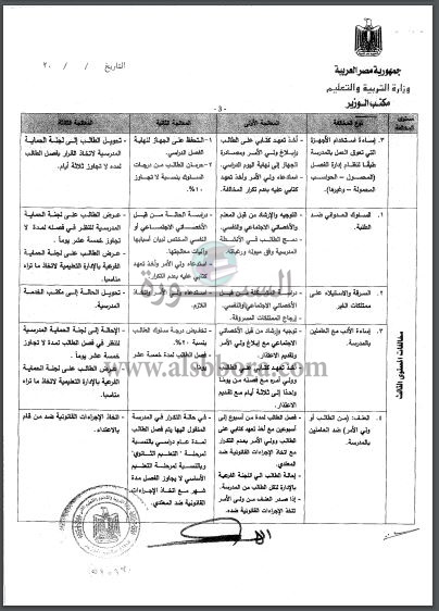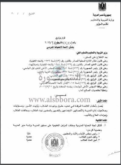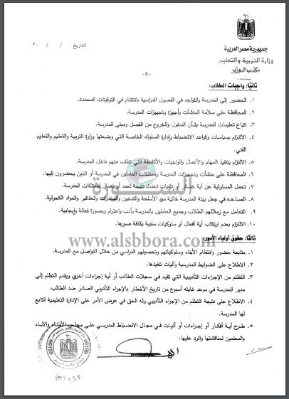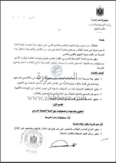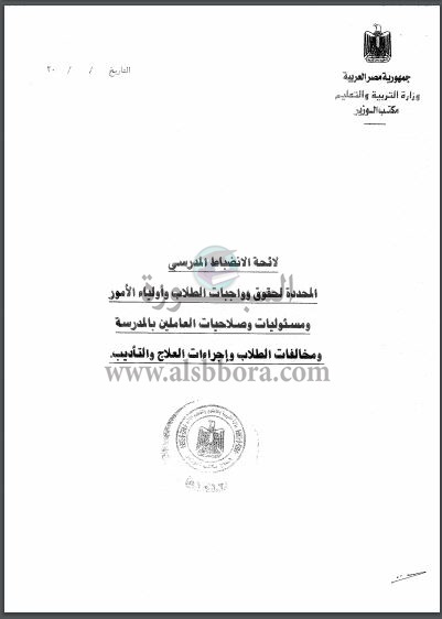 ينشر موقع السبورة لائحة الانضباط المدرسى المحددة لحقوق وواجبات الطلاب وأولياء الأمور ومسئوليات وصلاحيات العاملين بالمدرسة ومخالفات الطلاب وإجراءات العلاج والتأديب، وللدخول على اللائحة.