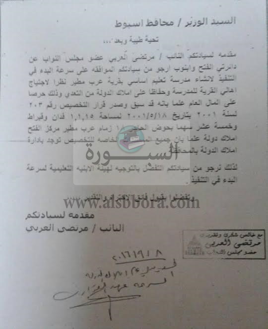 نجح النائب مرتضى العربي، عضو مجلس النواب، عن دائرة أبنوب والفتح بأسيوط فى الحصول على موافقة المهندس ياسر الدسوقى، محافظ اسيوط، بتحويل ملف إنشاء مدرسة تعليم اساسى بقرية عرب مطير إلى إدارة املاك الدولة بالمحافظة وجارى تخصيص قطعة أرض بحوض الحاجر 18 زمام عرب مطير لأنشاء المدرسة.