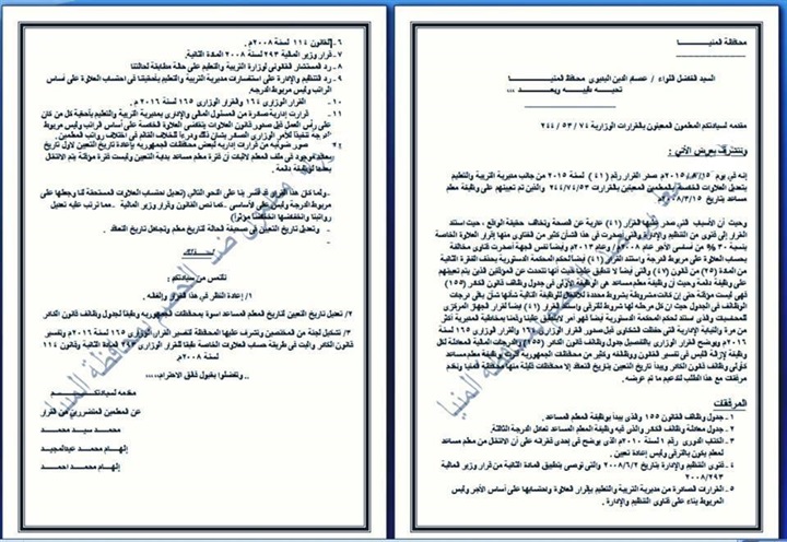 قدم المعلمون المعينون بالقرارات الوزارية 74 / 53 / 244 مذكرة الى اللواء عصام الدين البديوى محافظ المنيا يطالبون فيه بتعديل العلاوات الخاصة بهم علما بأنه قد تم تعيينهم على وظيفة معلم مساعد بتاريخ 2008/3/15.