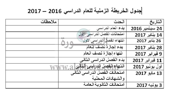 ننشر الخريطة الزمنية للعام الدراسى الجديد.. إجازة نصف العام 28 يناير 2017.. امتحانات الثانوية العامة 3 يونيو