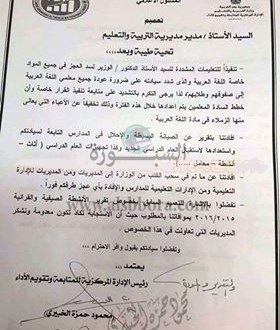 ارسلت الادارة المركزية للمتابعة و تقويم الاداء بوزارة التربية والتعليم فاكس تعميم لجميع المديريات بسرعة تنفيذ القرارات الوزارية بعودة المعلمين و خاصة معلمي اللغة العربية للمدارس لسد العجز وتخفيفا على زملائهم بالمدارس.