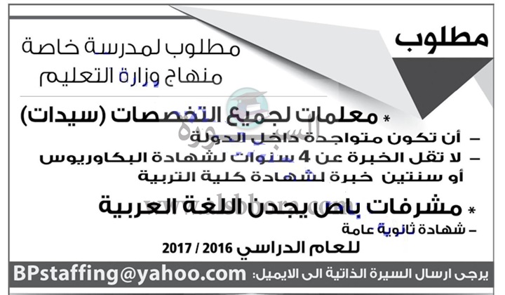 تعلن مدرسة خاصة في دولة الاماراتية تعلن عن وظائف جديدة للمعلمين في جميع المواد وفقا لنص الاعلان التالي