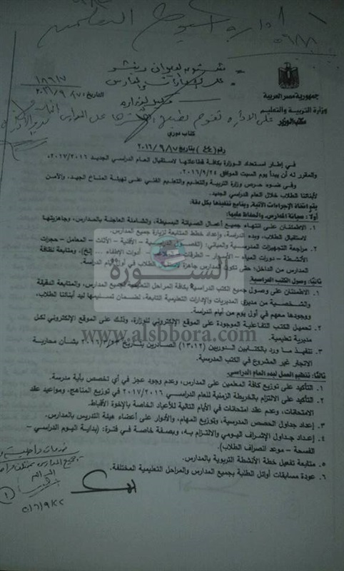 ينشر موقع السبورة الكتاب الدورى رقم 44 بتاريخ 17 سبتمبر 2016، بشأن استعدادات المدارس والمديريات التعليمية ببدء العام الدراسى الجديد 2017/2016.