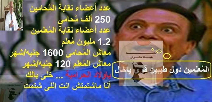 تداول نشطاء التعليم والمعلمين على موقع التواصل الاجتماعى "فيسبوك" كوميكس يقارن بين معاش المحامين والمعلمين، حيث اتضح أن الفارق بينهما شاسع وكبير، وأوضح الكوميكس أن عدد أعضاء نقابة المحامين 250 ألف محام، وعدد اعضاء نقابة المعلمين 1.2 مليون معلم. ومعاش المحام 1600 جنيه فى الشهر، بينما معاش المعلم النقابى 120 جنيه فى الشهر.