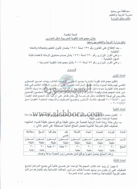 ينشر موقع السبورة اللائحة التنظيمية لمجموعات التقوية المدرسية داخل المدارس والتى أقرها محافظ بورسعيد، وجاءت كالتالى: