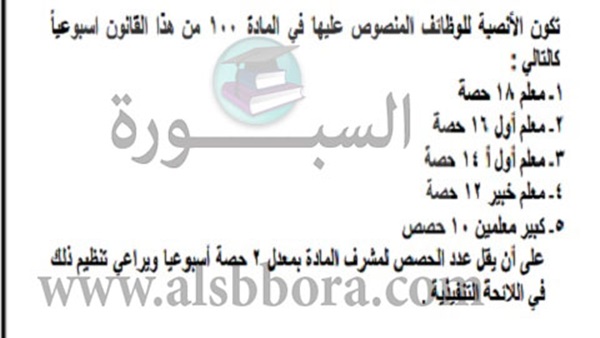 وقد حددت وزارة التعليم النصاب القانونى لكل معلم فى جميع مراحل التعليم سواء المرحلة الابتدائية أو المرحلة الاعدادية أو المرحلة الثانوية .