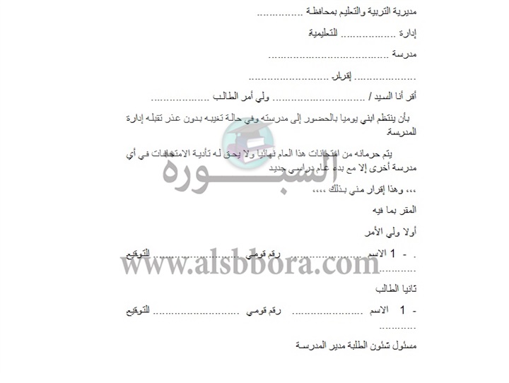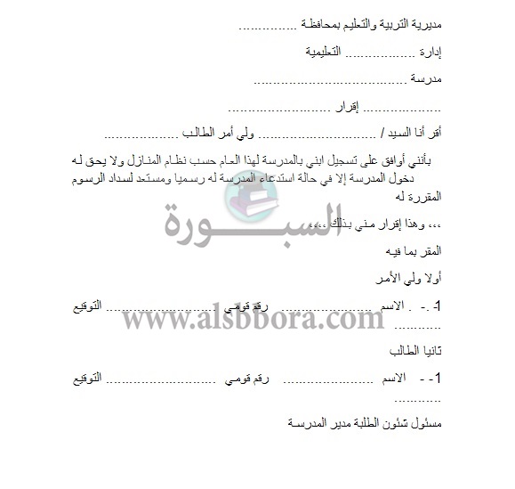 1 - قيام أولياء الأمور وخاصة في المدارس التي بها ظاهرة الغيام المتكرر والمستمر بالتوقيع على إقرار قبل بدء العام الدراسي.