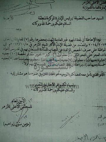 ننشر الفاكس الخاص بصرف الحصص الزائدة عن النصاب القانونى لمعلمى الأزهر.. معلم أول وكبير وخبير 10 جنيهات ومعلم مساعد 5 جنيهات