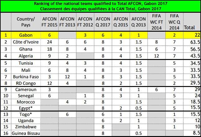 جاء تصنيف المنتخبات المشاركة فى البطولة بهذا الترتيب، وفقاً لما أسفر عنه اجتماع اللجنة المنظمة للبطولة، اليوم الثلاثاء، فى مقر "الكاف" بالقاهرة، باحتساب عدد معين من النقاط لكل منتخب على حدة، وفقاً لأدائه فى بطولات كأس الأمم الأفريقية 2012، 2013 و2015، تصفيات كأس الأمم الأفريقية 2013، 2015 و2017، كأس العالم 2014 والتصفيات المؤهلة لكأس العالم 2014.