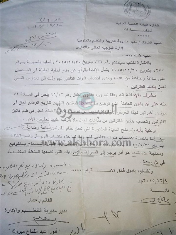 ينشر موقع السبورة كتاب الجهاز المركزي للتنظيم والادارة - الادارة العامة للخدمة المدنية، إلى مدير مديرية التربية والتعليم بالمنوفية، بشأن أحقية المعلمة التي تعمل بنظام الفترتين في الحصول على ساعة رضاعة والمؤرخ في 9 - 12- 2015م.