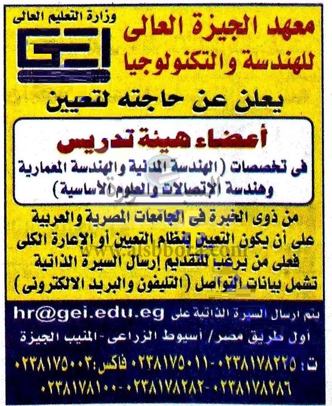 يعلن معهد الجيزة العالي عن وظائف شاغرة لأعضاء هيئة التدريس وذلك وفقا لنص الإعلان التالي: