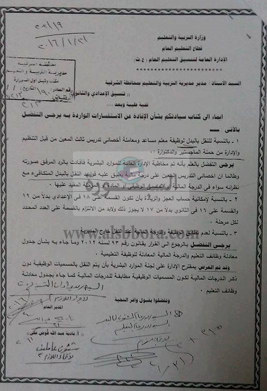 ننشر فاكس وزارة التربية والتعليم بشأن تقسيم النصاب الاسبوعى على عدد أيام العمل