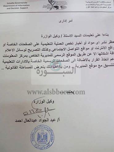 أصدر عبد الجواد عبد العال وكيل وزارة التربية والتعليم بالاسماعيلية قرارا إداريا لتنظيم العمل داخل الديوان والادارات التعليمة فيما يتعلق بنشرالاخبار والمواد التعليمية.