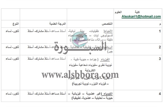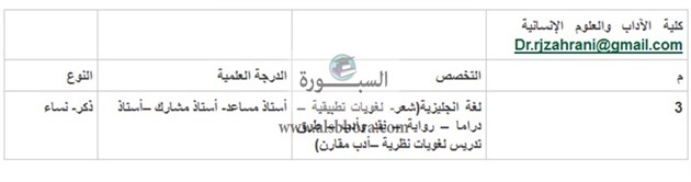تعلن جامعة الباحة السعودية عن حاجتها من أعضاء هيئة التدريس من حملة الدكتوراه من الجنسين وذلك حسب التخصصات الموضحة في الجدول التالي: