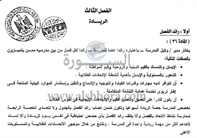 التعليم: حصة الريادة ضمن النصاب الأسبوعى لرائد الفصل.. ولا تتعدى الحصة الرابعة.. ولا يكلف رائد الفصل بأى حصص احتياطية فى نفس يوم الريادة