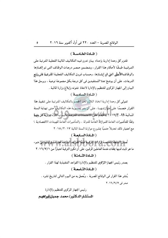 أصدر المستشار محمد جميل رئيس الجهاز المركزي للتنظيم والإدارة قراراً بترقية جميع العاملين بالجهاز الإداري في الدولة ووحدات الإدارة المحلية والهيئات العامة والذين قد أتموا المدد البينية للترقية إلى الدرجات الأعلى حتى 30 يونيو 2016.