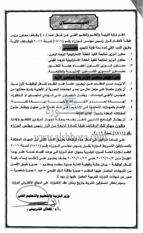 تعلن وزارة التربية والتعليم والتعليم الفنى، عن التقدم لشغل عدد 4 وظائف معاون وزير طبقا لاحكام قرار رئيس مجلس الوزراء رقم (1811) لسنة 2016 للوظائف الآتية بطريق الندب الكلي لمدة سنة قابلة للتجديد وهي: