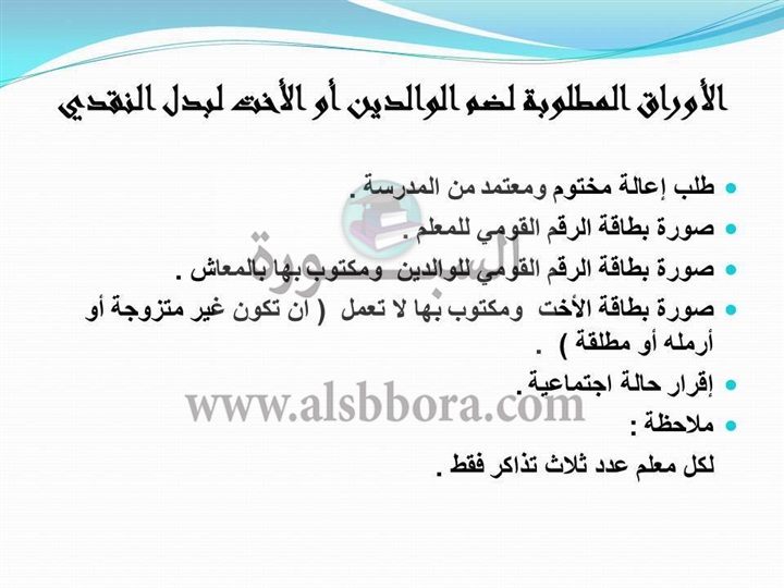 ينشر موقع السبورة الأوراق المطلوبة لضم الوالدين أو الأخت لبدل النقدى.