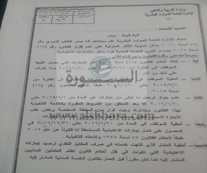 العامة للموارد البشرية بوزارة التربية والتعليم فاكساَ لمديريات التربية والتعليم