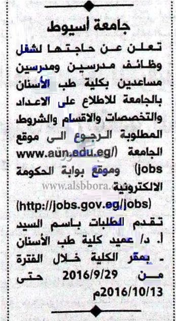 تعلن جامعة أسيوط عن وظائف شاغرة لأعضاء هيئة التدريس "من معيد الي أستاذ" وأخر موعد للتقديم 13 أكتوبر وذلك وفقا لنص الإعلان التالي: