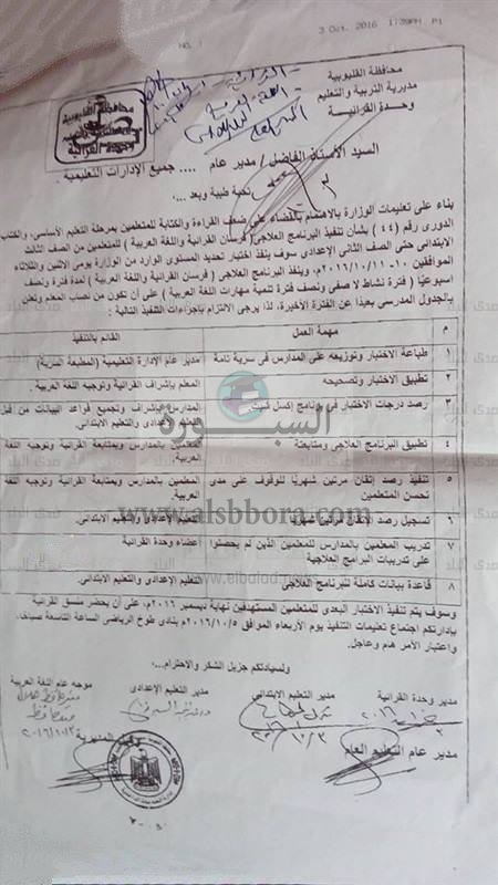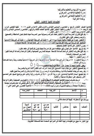 ننشر فاكس إجراءات اختبار القرائية وكيفية رصد درجاتها.. ومواعيد الامتحانات للصفوف من الثالث الابتدائى الى الثانى الاعدادى