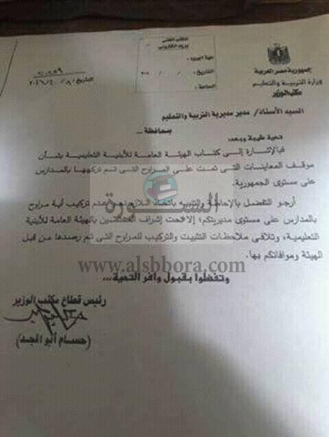 ونص القرار الذي أصدره اللواء حسام أبو المجد رئيس قطاع مكتب الوزير بحظر التعامل وتركيب أية مراوح داخل الفصول إلا من خلال الأبنية التعليمية وتلافي ملاحظات التركيب والتثبيت لما تم تركيبه قبل إجراء الهيئة معاينة تلك الفصول خلال الفترة الماضية وإخطارها بها.