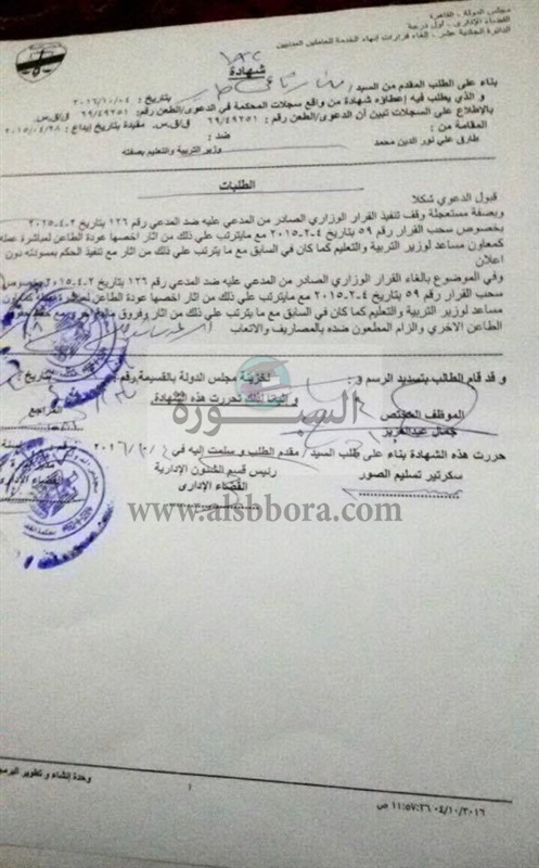 من محكمة عابدين ينذر وزير التربية والتعليم بوقف المسابقة الجديدة التى تم الاعلان عنها مؤخرا