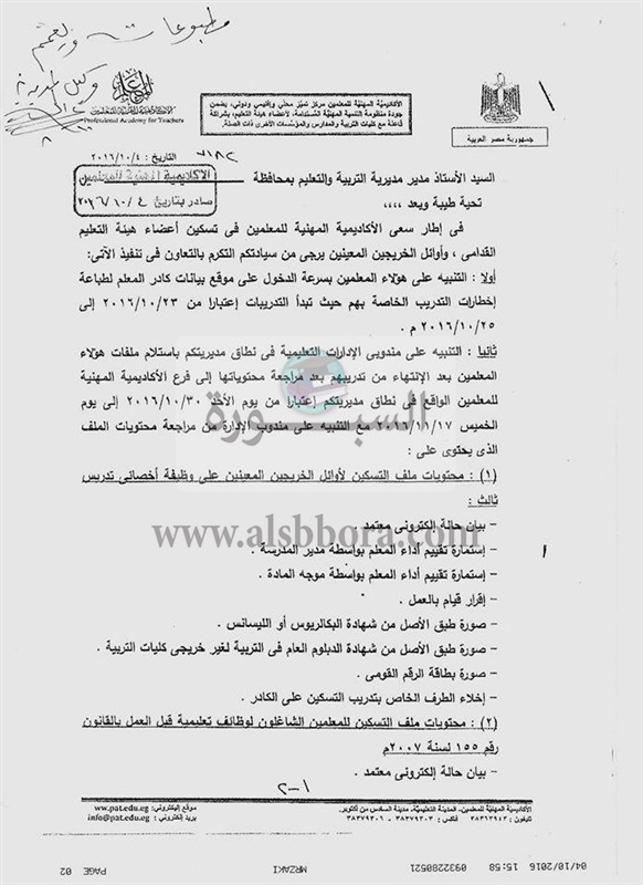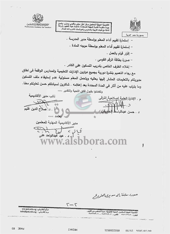 ننشر فاكس اكاديمية المعلمين بشأن فتح باب التسكين على الكادرلأعضاء هيئة التعليم القدامى وأوائل الخريجين المعينين