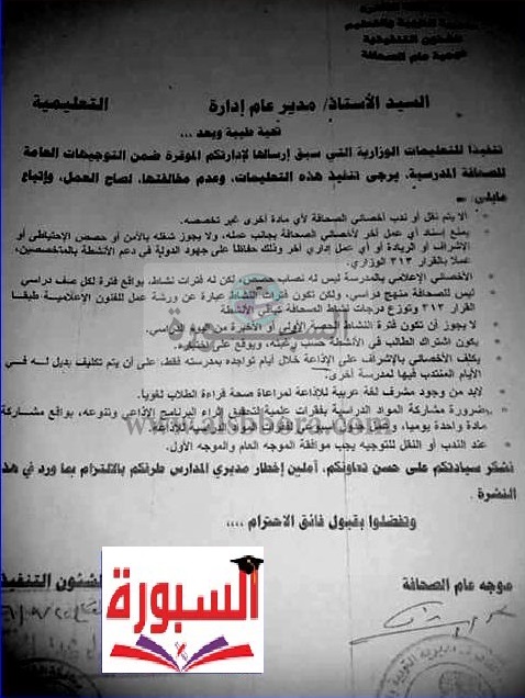 عاجل.. "التعليم": لايجوز نقل أو ندب اخصائى الصحافة لأى مادة أخرى غير تخصصه.. ولا يجوز شغله بالأمن أو حصص الاحتياطى أو الاشراف أو الريادة أو أى عمل إدارى آخر