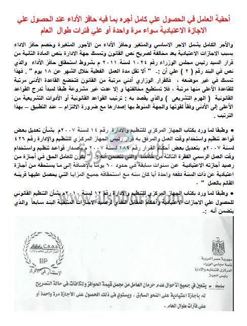ينشر موقع السبورة أحقية العامل والمعلم فى الحصول على كامل أجره بما فيه حافز الآداء عند الحصول على الاجازة الاعيادية سواء مرة واحة أو على فترات طوال العام.
