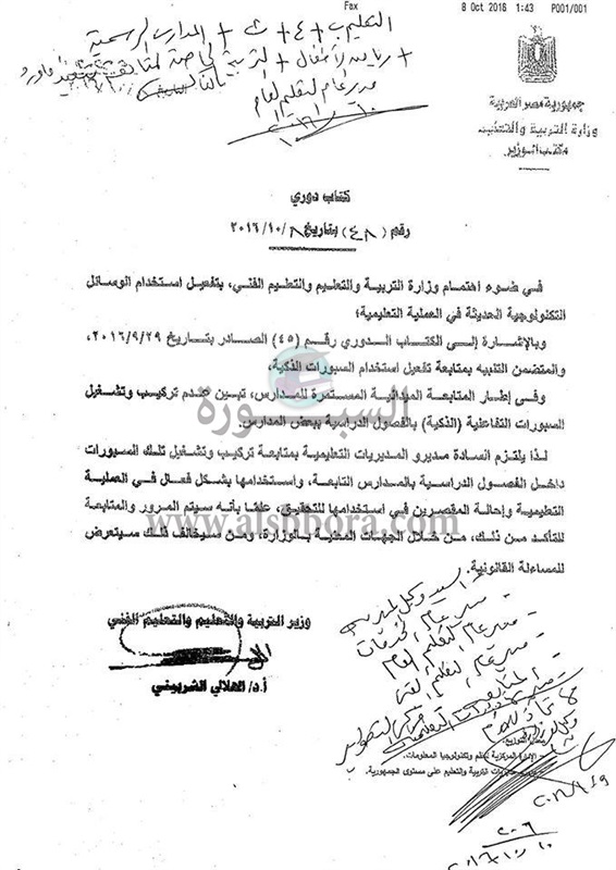 أرسلت وزارة التربية والتعليم كتابها الدورى رقم 48 بتاريخ 2016/10/8 بشأن تفعيل السبورات الذكية فى الفصول، وسوف يحال أى مدير مدرسة للتحقيق فى حال عدم استخدام السبورة الذكية داخل الفصول.