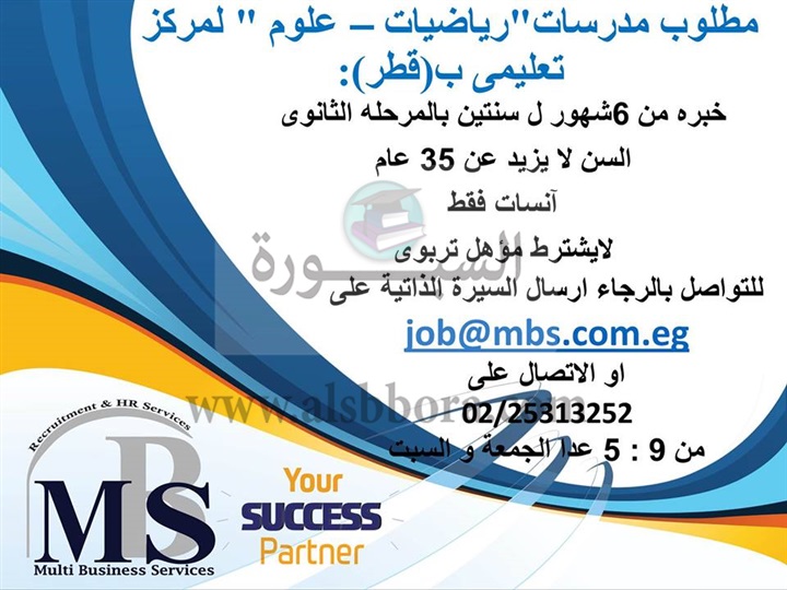 يعلن احدى المركز التعليمية الكبرى بدولة قطر عن حادتها الى معلمات، وعلى الراغبين فى التقدم ارسال السيرة الذاتية على الايميل المنشور فى الاعلان التالى: