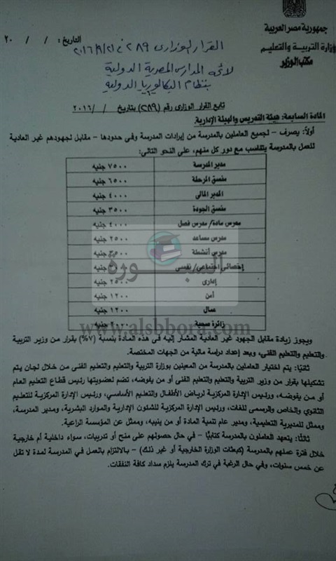 ينشر موقع السبورة لائحة المدارس المصرية الدولية بنظام الباكالوريا الدولية والقرار الوزارى رقم 289 والذى تم اصداره فى 21 سبتمبر 2016 والخاص بصرف مقابل مادى للجهود غير العادية لجميع العاملين بالمدارس على النحو التالى والمنصوص عليه فى القرار التالى: