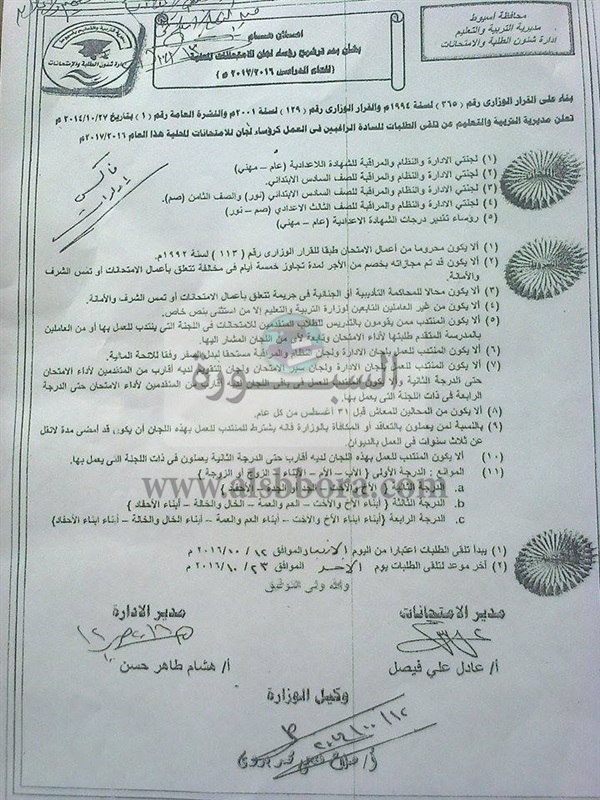 اعلنت مديرية التربية والتعليم بمحافظة اسيوط عن تلقى الطلبات للراغبين فى العمل كرؤساء لجان للامتحانات المحلية هذا العام 2017/2016، على ان يكون آخر موعدا للتقديم يوم الأحد الموافق 23 اكتوبر الجارى.