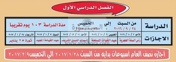 ينشر موقع السبورة مواعيد امتحانات الفصل الدراسى الأول 2017/2016 وموعد اجازة نصف العام، والاجازات التى سوف تمنح خلال هذا الفصل، ضمن الخريطة الزمنية التى أعلنتها وزارة التربية والتعليم، وتبدأ امتحانات الفصل الدراسى الأول 14 يناير، وتنتهى 26 يناير 2017.