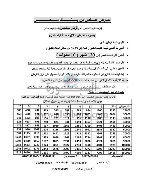 أعلن بنك مصر عن فرصة كبيرة للحصول على قرض شخصى بأسهل الاجراءات ويتم صرف القرض خلال خمسة أيام عمل دون التوجه للبنك ويتم الاتصال بمندوبى البنك والذى سوف يصل الى محل العمل للمقترض فى أسرع وقت وبمجرد انتهاء المكالمة، ولمزيد من التفاصيل داخل الاعلان التالى: