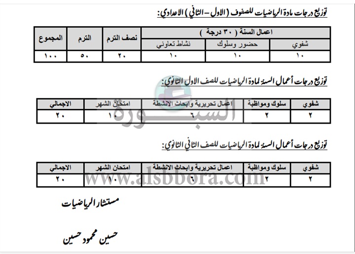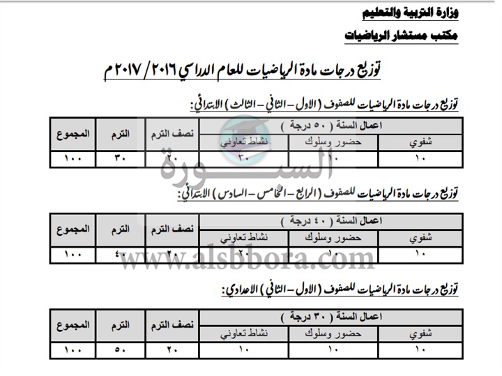 ننشر توزيع درجات مادة الرياضيات بجميع المراحل للعام الدراسي 2016/ 2017