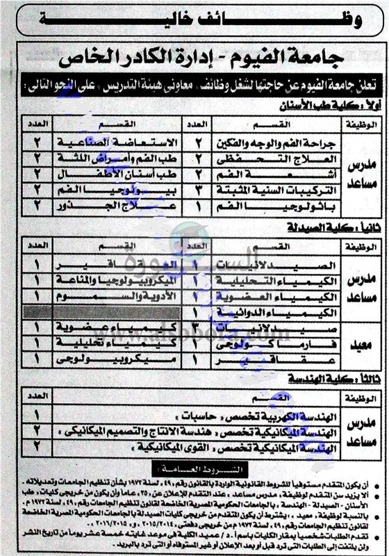 تعلن جامعة الفيوم عن حاجتها الى أعضاء هيئة التدريس، وعلى الراغبين فى التقديم للحصول على الوظيفة، التقدم الى الاستاذ الدكتور عميد الكلية فى موعد غايته أسبوعين من تاريخ نشر الاعلان والذى صدر فى تاريخ اليوم الأربعاء الموافق 19 أكتوبر 2016 بجريدة الجمهورية.
