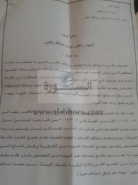 تجاهل مسؤل التعليم الفني بالأقصر تأشيرة محمد سيد بدر محافظ الأقصر بالموافقة على عودة سيد محمد إبراهيم القرناوى موجه عام نجارة الأثاث