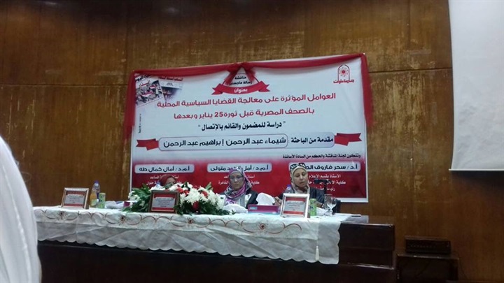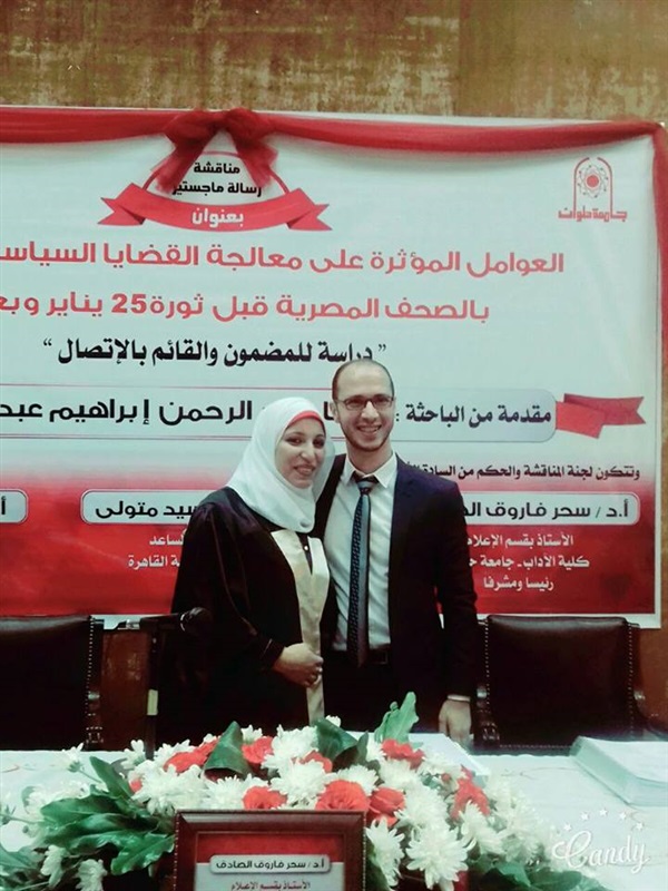 حصلت الباحثة شيماء عبدالرحمن ابراهيم علي درجة الماجستير بامتياز من قسم الإعلام جامعة حلوان للباحثة الباحثة عن " العوامل المؤثرة على معالجة القضايا السياسية المحلية بالصحف المصرية قبل ثورة 25 يناير وبعدها "