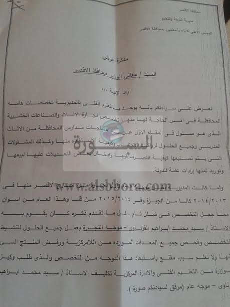 تجاهل مسئول التعليم الفني بالأقصر تأشيرة محمد سيد بدر، محافظ الأقصر، بالموافقة على عودة سيد محمد إبراهيم القرناوى، موجه عام نجارة الأثاث، مما ادى الى دخوله مكتب وكيل الوزارة واغلاقه بالمسامير.