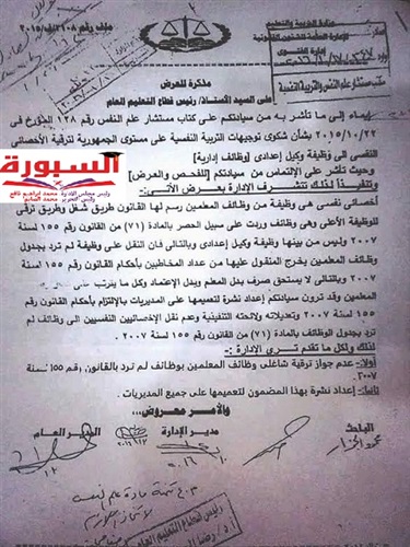 تفيد بعدم جواز ترقى الأخصائى النفسى لدرجة وكيل أو مدير اعدادى بحجة أن تلك