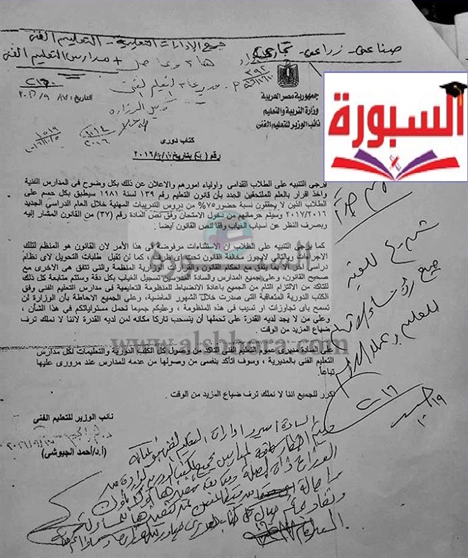 ينشر موقع السبورة الفاكس الخاص من وزارة التربية والتعليم الى المديريات التعليمية بشأن نسية حضور الطلاب الملحقين بالتعليم الفنى والذين لا يحققون نسبة حضور 75% من دروس التدريبات المهنية خلال العام الدراسى الجديد 2017/2016 حرمانهم من الامتحانات.