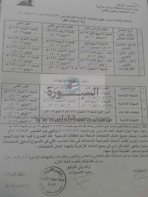 ينشر موقع السبورة مواعيد امتحانات النقل والشهادة الازهرية للعام الدراسى 2017/2016 للفصلين الدراسيين الأول والثانى،ولمزيد من التفاصيل عبر الجدول التالى: