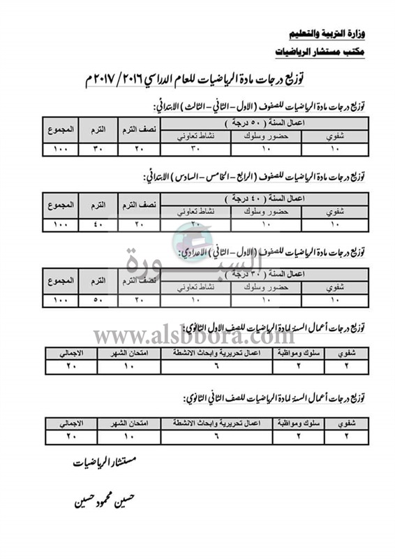 تنشر "السبورة" توزيع درجات جميع المواد الصادرة من مكاتب مستشارين المواد للعام الدراسى 2016 / 2017 لجميع المراحل التعليمية من المرحله الابتدائية حتى المرحله الثانوية .