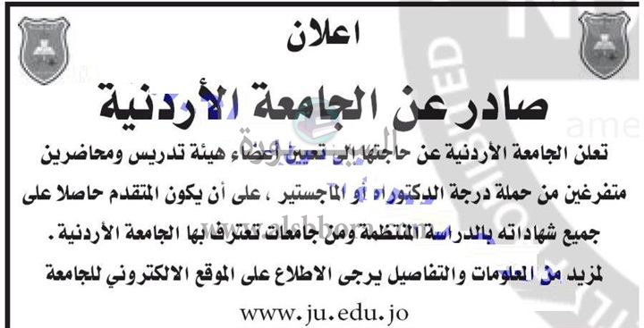 تعلن الجامعة الأردنية عن وظائف جديدة لأعضاء هيئة التدريس في جميع التخصصات "من معيد الي أستاذ" وذلك وفقا لنص الإعلان التالي: